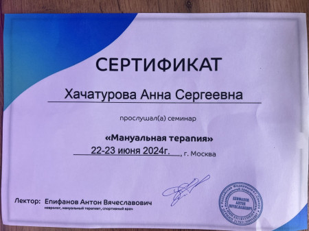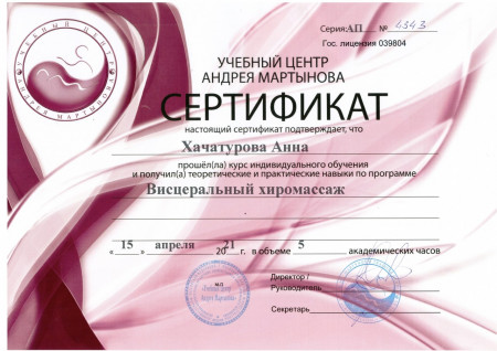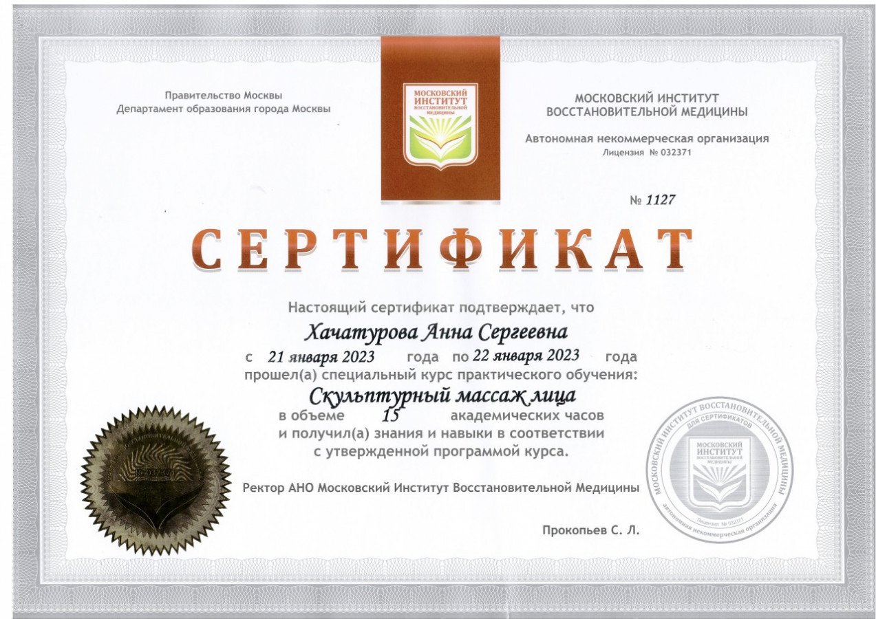Высшее.Среднее медицинское. Высшее медицинское, специалитет Лечебное дело. Московский институт восстановительной медицины, курсы медицинского массажа. Курсы массажа А. Мартынова, Школа векторного массажа и соматики С. Черноног .